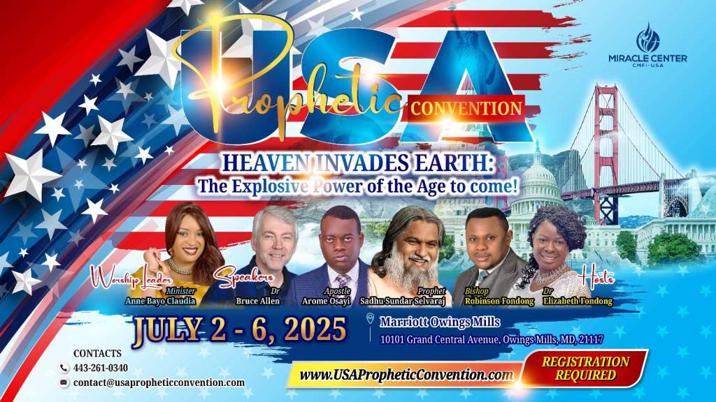 Believers from around the world are gathering in the Baltimore area for the USA Prophetic with world renowned speakers such as Prophet Sadhu Sundar Selvaraj, Apostle Arome Osayi, Dr Bruce Allen, Bishop Robinson, and Dr Elizabeth Fondong. This glorious event is taking place from July 2nd to the 6th at the Marriott Owings Mills Hotel.